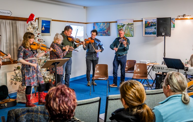The culmination of the project was a public performance on 18 December 2023, coinciding with Oideas Gael's Christmas celebration. This included a new composition, Teach Pobail an Spáinnigh, directly inspired by the heritage theme, several songs and tunes related to the area in which Cill an Spáinnigh is situated, and two instrumental pieces inspired by the kind of music that might have been familiar to the Spanish sailor from the story, such as Mille regretz — La Canción del Emperador by Luis de Narváez (c.1500–1552). In addition, our heritage expert Eoghan Ó Curraighín retold the story of Cill an Spáinnigh as well as another saga tale, Cath Fionn Trá, which takes place in associated locations. The event was attended by over 60 people, including a number of new residents in the area who arrived as a result of the war in Ukraine.
